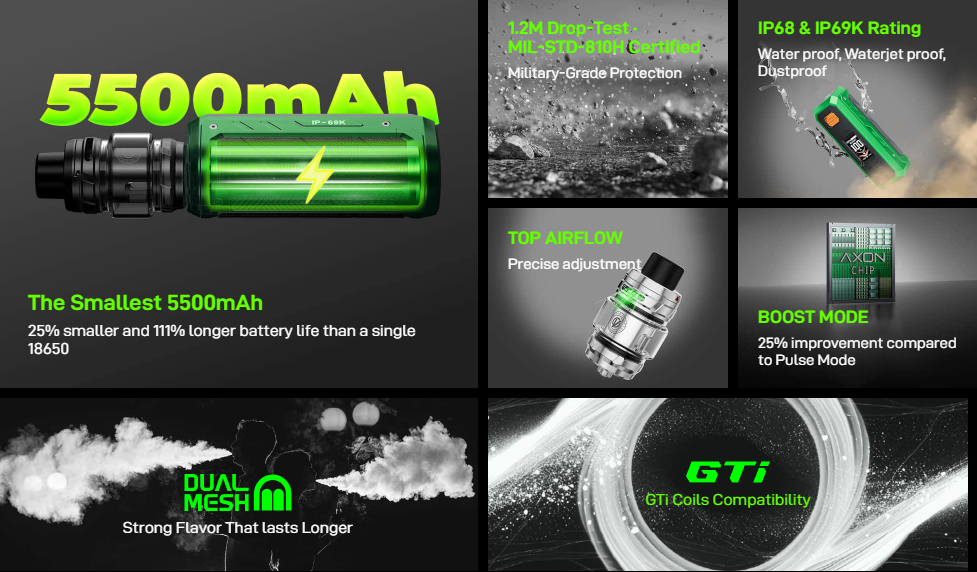 Le chipset AXON offre des modes avancés : Boost Mode, Eco, Pulse, contrôle de température… pour adapter la vape selon le style.